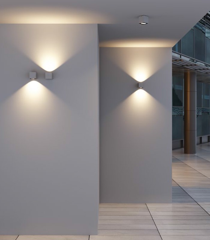 Teko di Redo è un cubo composto interamente in pressofusione di alluminio e verniciato a polveri nei colori: bianco opaco, grigio scuro o marrone con diffusori in vetro temperato trasparente posti alle estremità della lampada. La fonte luminosa LED COB emette un flusso luminoso efficiente e ad alta luminosità.