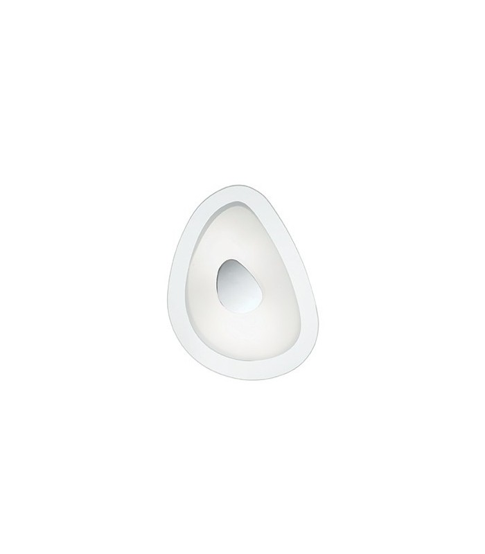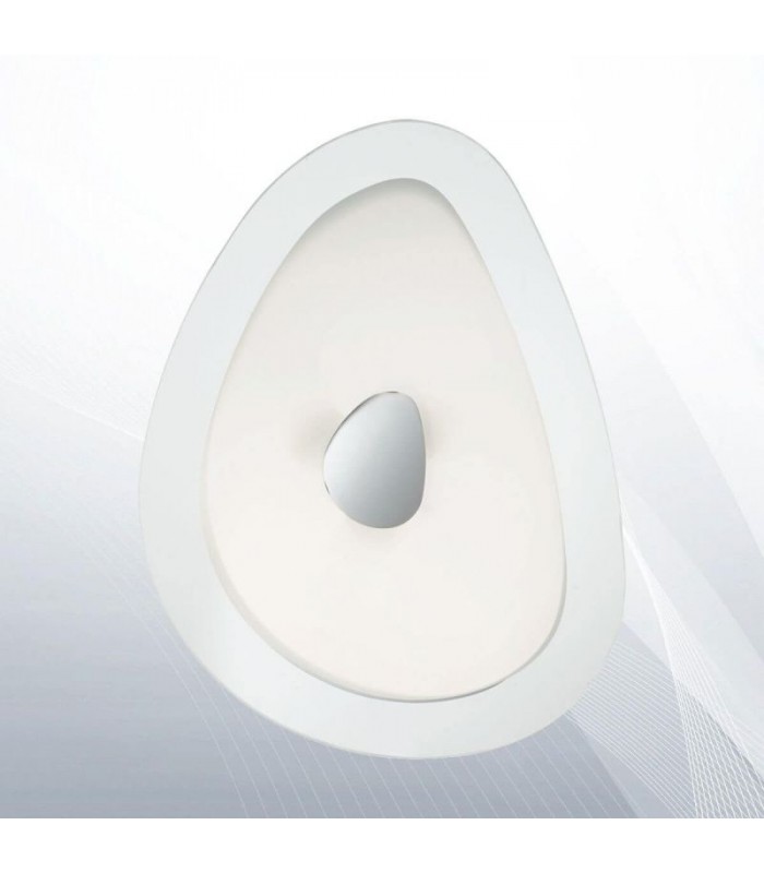 Geko è una lampada da soffitto con struttura in metallo smaltato bianco mentre il diffusore dalla forma moderna e sinuosa è composto da una lastra in vetro trasparente e serigrafata in bianco nella parte centrale. L' elemento decorativo posto al centro è in metallo cromato e funge da fissa vetro.