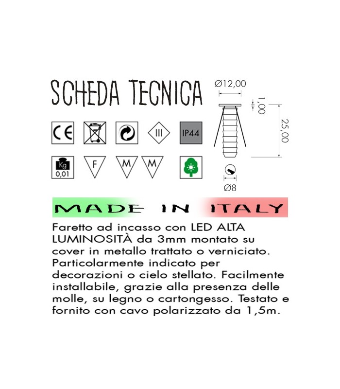 Kit Cielo Stellato composto da diciotto microspot disponibili con varie temperature di colore (Luce calda 3000K, Luce fredda 6000K), con cornice disponibile nelle finiture bianco RAL 9010 oppure cromo lucido. Realizzato totalmente in alluminio per un ottima dissipazione del chip LED, garantisce un elevata durata (circa 80.000 ore). Ogni spot ha un cavo di 1,5 metri con plug di connessione rapida. Il plug di connessione del faretto permette al produttore di testare ogni singolo spot per 24h dopo la fase produttiva, per assicurare al cliente finale un prodotto privo di imperfezioni.