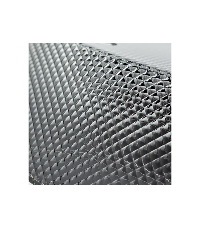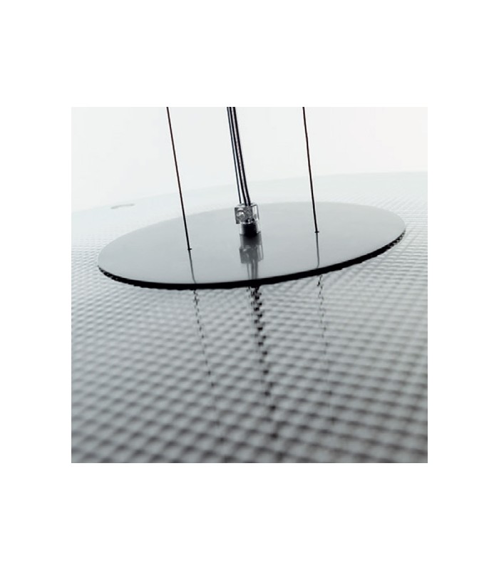 Lungo il perimetro la luce è più chiara poiché minore è l'apporto di colore, mentre verso il centro, dove questa è maggiore, diminuisce l'intensità luminosa. Il diffusore di questa lampada inoltre è avvolto da un elemento strutturale in PMMA prismatico termoformato che diffonde la luce verso l' alto e verso i lati in modo omogeneo e gentile nell'ambiente circostante. Esso inoltre è il vero e proprio elemento strutturale della lampada su cui sono fissati il diffusore in vetro serigrafato e il kit di sospensione. Al centro del decoro è posto un dischetto in alluminio lucido.