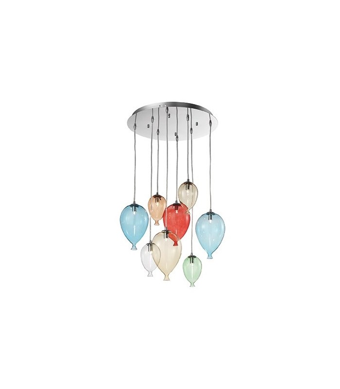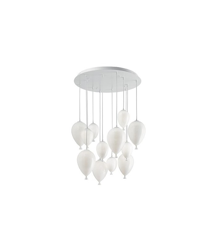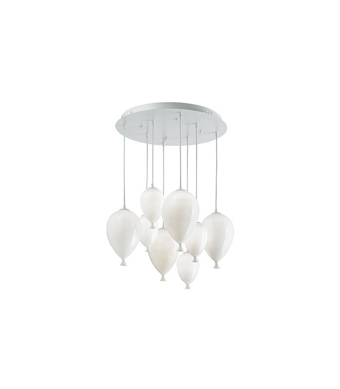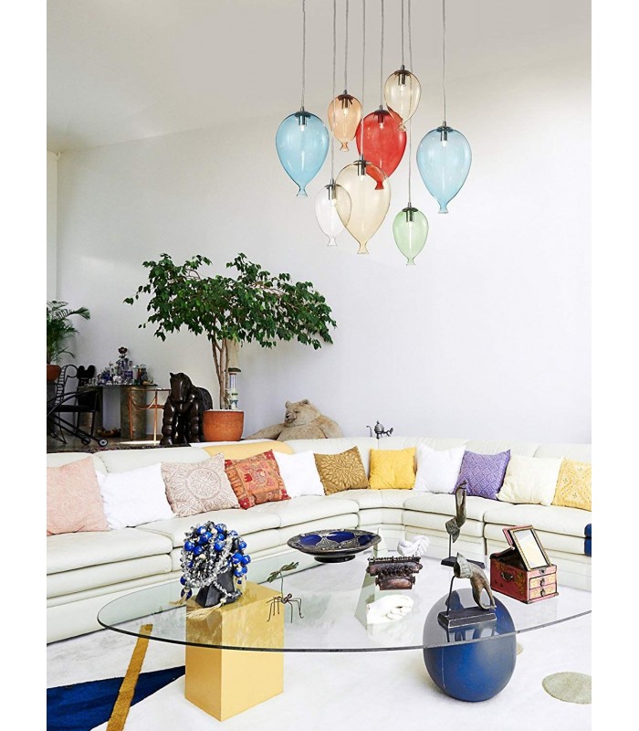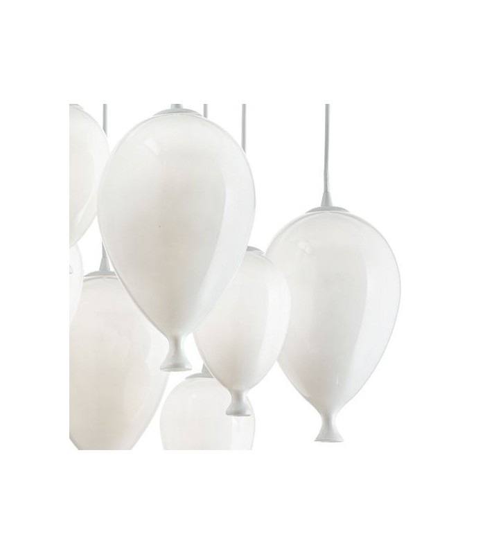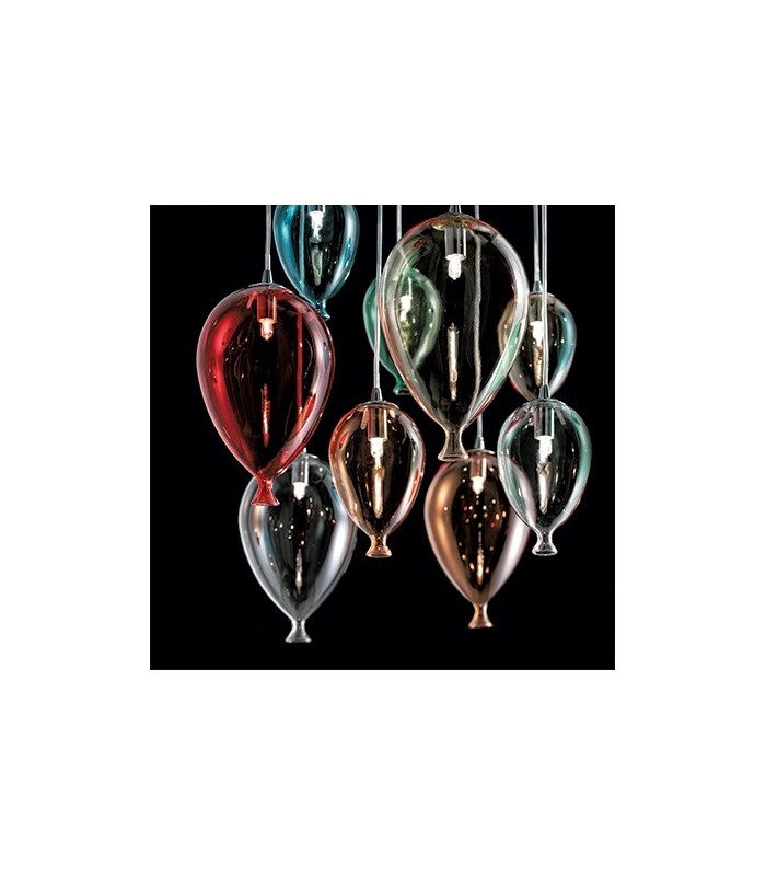 Decorativa e dallo spirito moderno questa lampada prevede tre varianti di grandezza: sette luci, otto e dodici luci, due finiture per la montatura quali bianca con diffusori bianchi e cromo con diffusori multicolor trasparente o cromo.