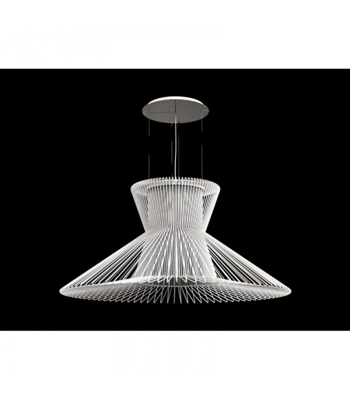 Metallux Impossible può essere utilizzata sia come lampada a sospensione che come lampada da soffitto grazie ai cavi regolabili in altezza, costituita in metallo lavorato e verniciato in bianco opaco, nero opaco, brunito oppure oro.