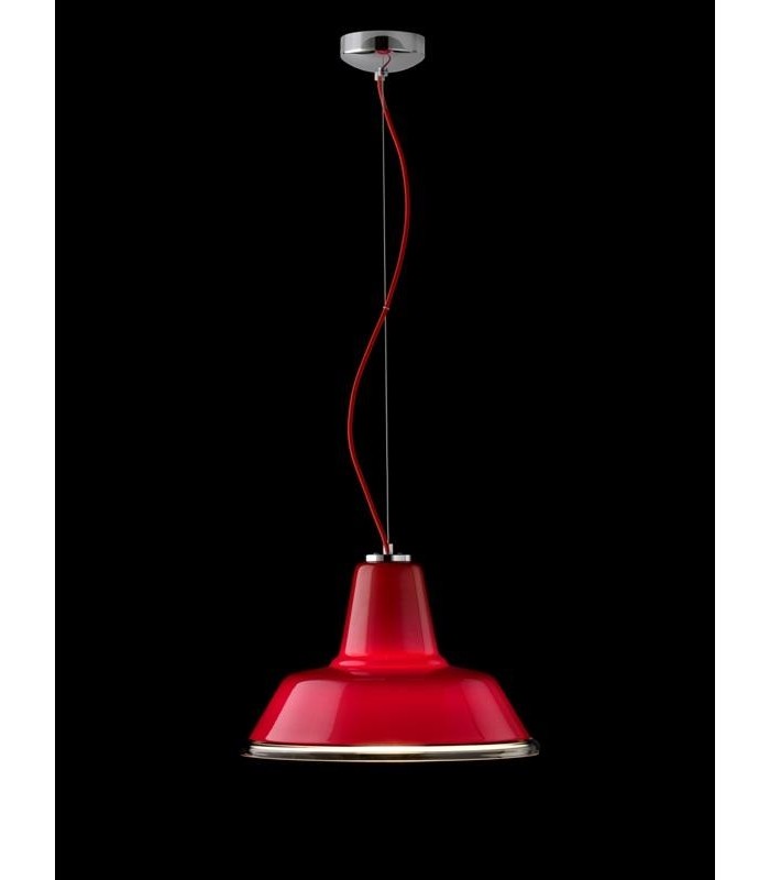 Lampara è composta da una montatura in metallo nella finitura cromo e da un prezioso diffusore in vetro soffiato di colore rosso e cavo elettrico in tessuto.