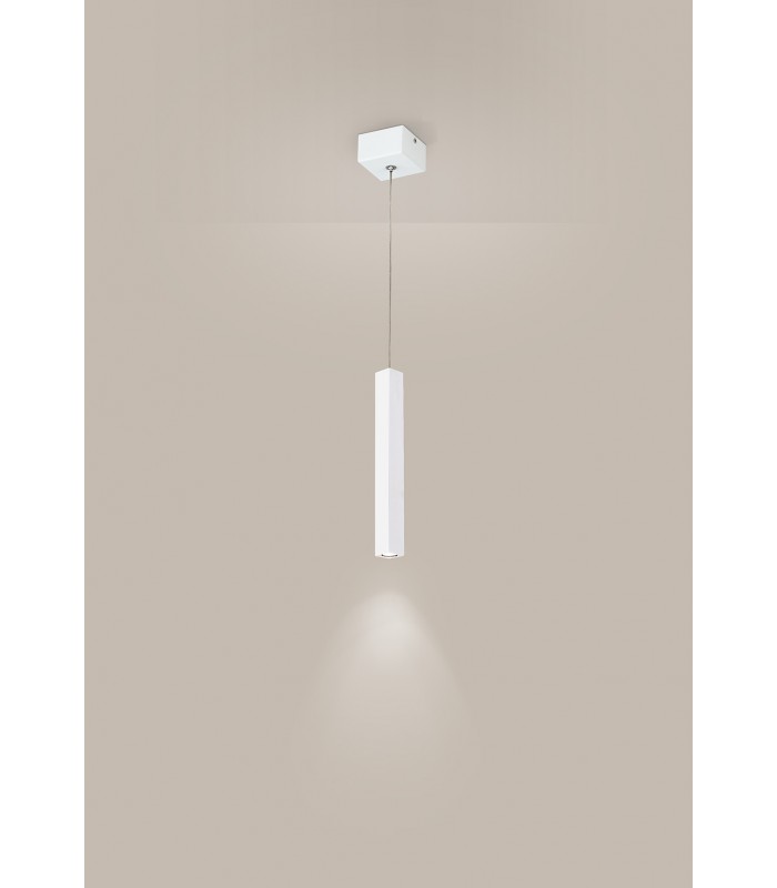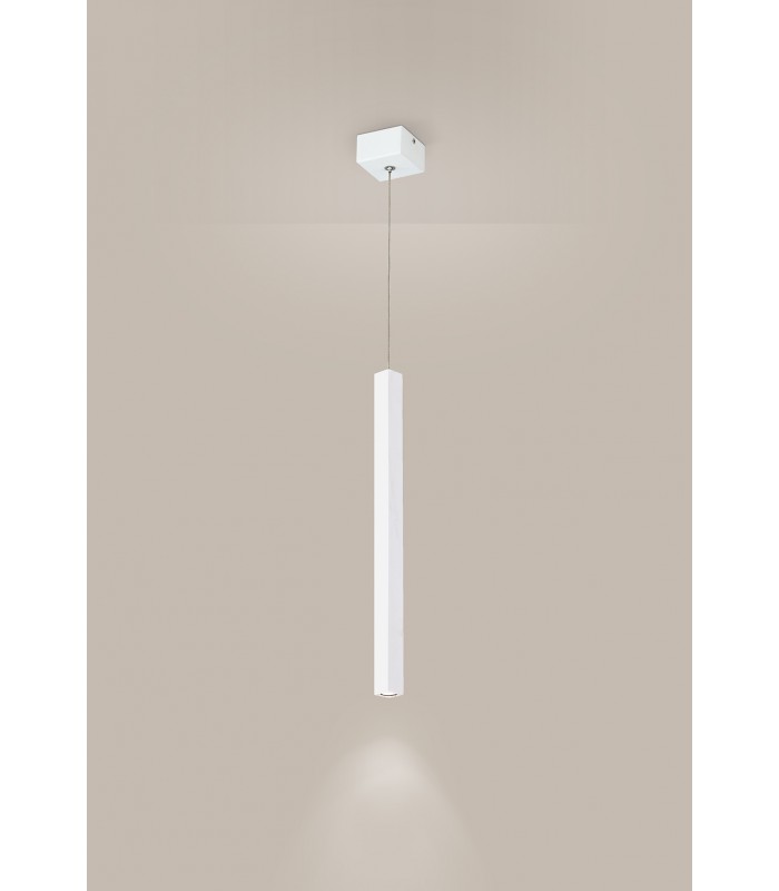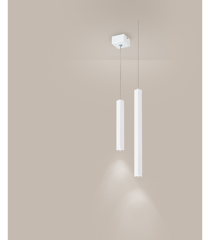 Lampade a Led che emettono luce diretta verso il basso in modo preciso e morbido. Tubi ha una forma allungata e quadrata realizzata in metallo verniciato in bianco con finitura sabbiata che la rende elegante e sofisticata.