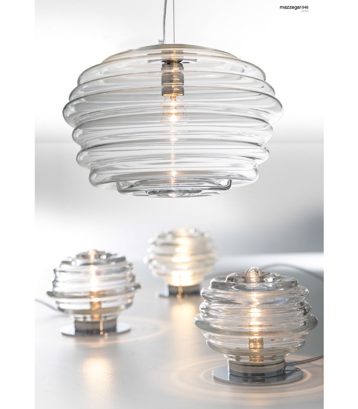 Mazzega 1946 Onda è una piccola lampada in sospensione composta da una struttura in metallo rifinita in cromo lucido e da un diffusore circolare e leggermente schiacciato nella parte superiore in cristallo trasparente lavorato a mano. Una tecnica di lavorazione paziente e artigianale che conferisce alla lampada unicità, preziosità e un effetto ottico sorprendente. Onda richiama un concetto semplice e poetico: il movimento dell'acqua sorpresa nella sua pazienza dall'irrompere del lancio di un sasso che genera in essa cerchi concentrici.