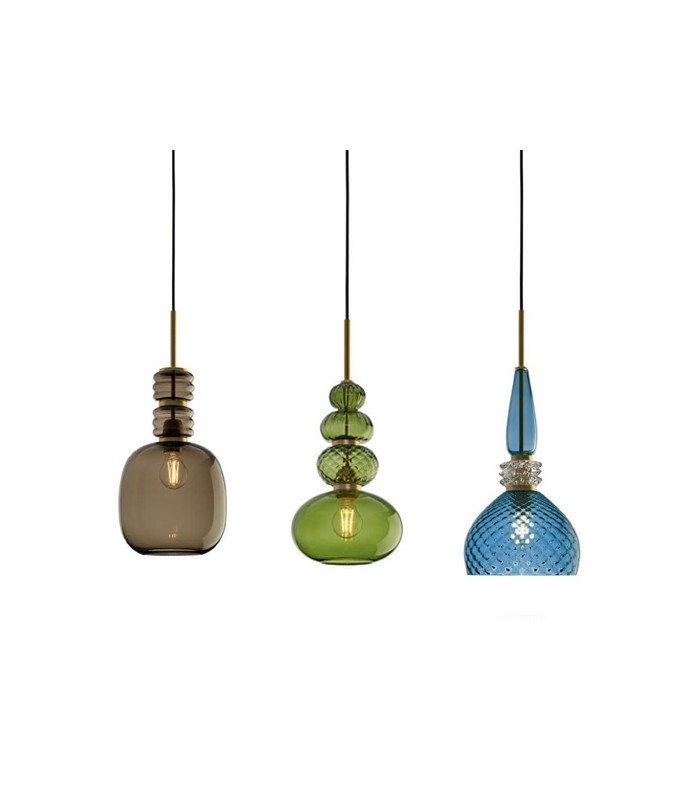 Lampada in sospensione a tre luci con struttura in metallo verniciato nella finitura oro satinato e diffusori in vetro soffiato e lavorato a mano. Disponibile nella versione trasparente e multicolore. VERSIONE CON BASE CIRCOLARE PER TRE ELEMENTI.