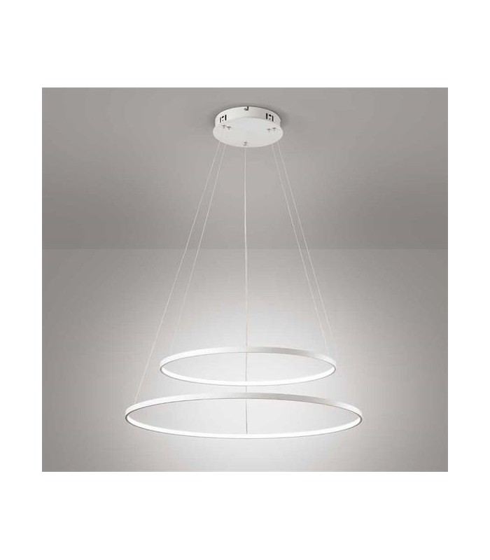 Affralux Aluring è composta da due cerchi concentrici in alluminio verniciato in bianco satinato dove al loro interno è alloggiata la fonte luminosa Strip LED che a luce accesa sottolinea e definisce con precisione la forma circolare della struttura. Due cerchi di luce che si incontrano tra loro in un gioco di altezze e assimetrie da personalizzare a piacimento, grazie ai cavi di alimentazione in acciaio regolabili in altezza che vi aiuteranno a creare effetti ottici e forme sempre diverse.