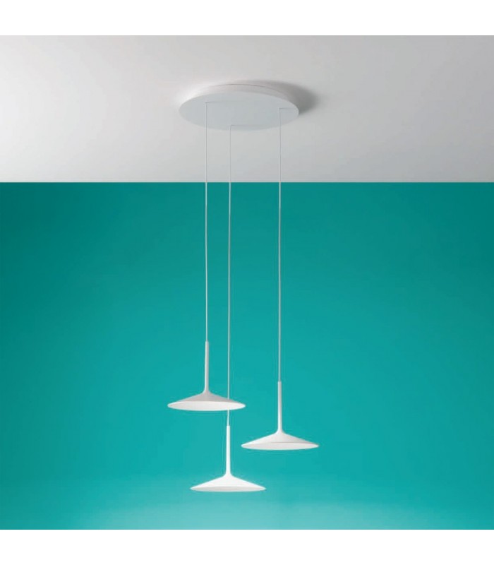 Un sottilissimo stelo in acciaio composto nella parte finale da un diffusore dalla forma circolare che si apre per dirige la luce verso il basso in modo preciso e puntuale. Tre piccole trombe che scendono dal soffitto per creare svariate composizioni luminose che arredano e illuminano in modo assolutamente efficiente i vostri spazi abitativi o gli spazi commerciali.