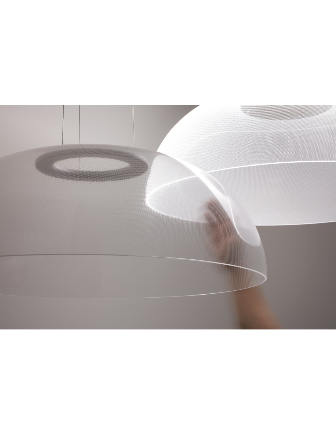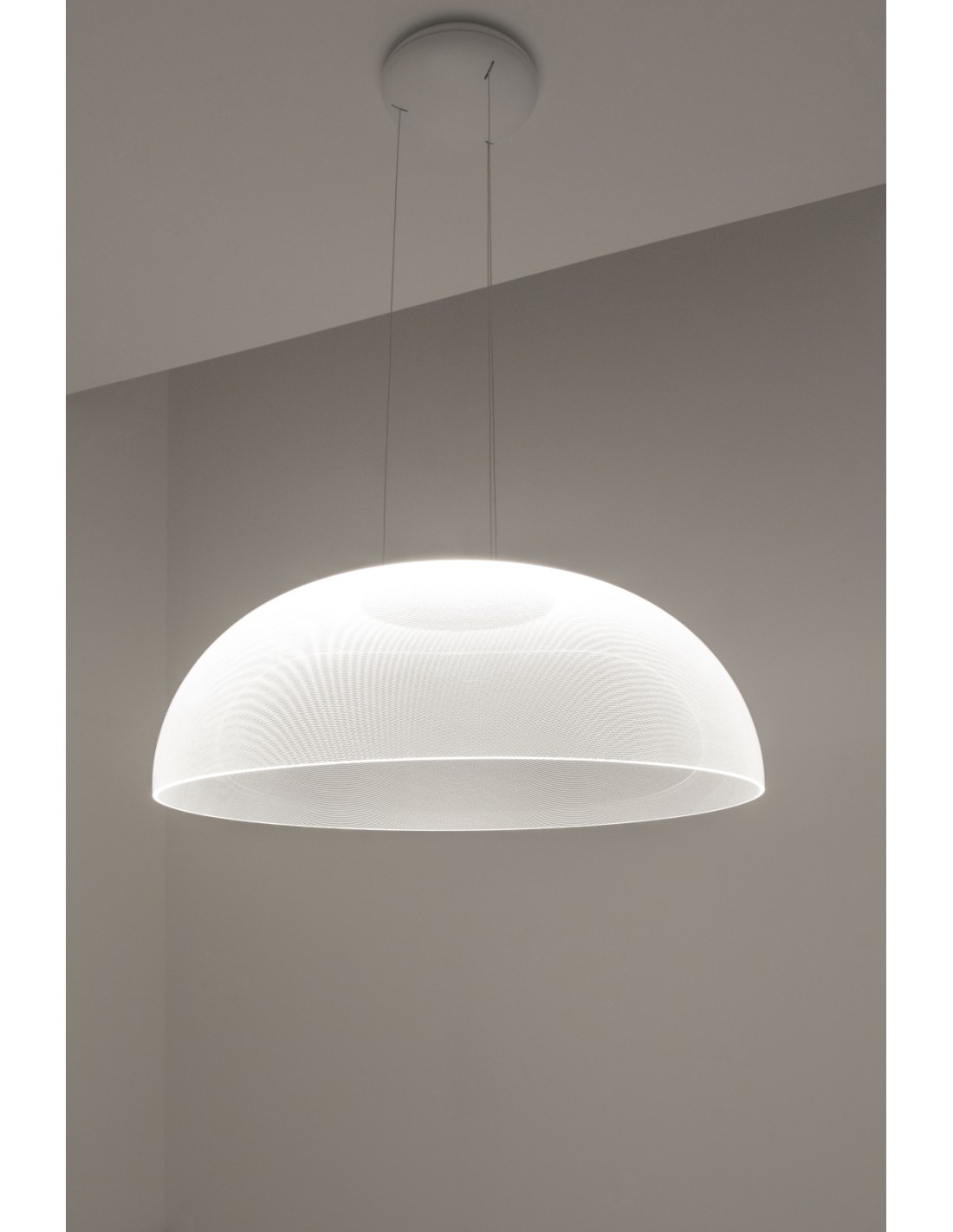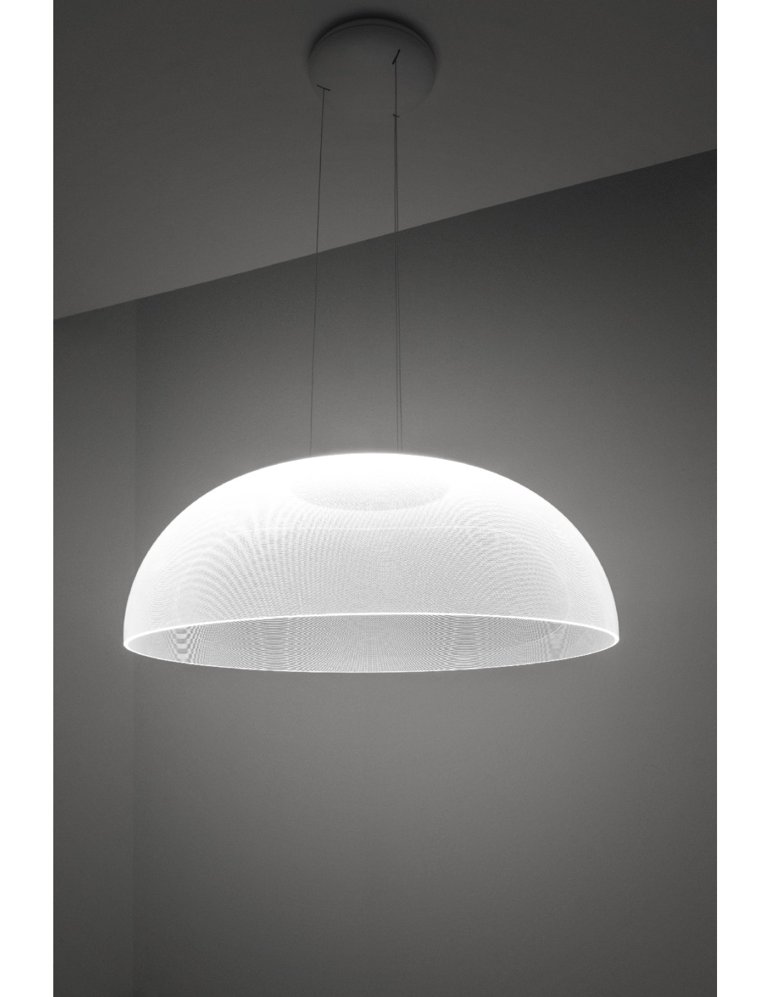 Demì di Stilnovo ha una montatura in alluminio verniciato in bianco e una campana in PMMA che sprigiona luce diretta e diffusa. Il diffusore in PMMA serigrafato a laser con micro incisioni OptiLight Technology (Tm) distribuisce la luce in modo ottimale ed efficace nel piano sottostante e tutto intorno mentre al centro della campana è posta la fonte luminosa Led che irradia di luce il diffusore per un effetto luminoso strepitoso. Grazie a questa tecnologia si ottengono due risultati: una volta spenta la lampada il diffusore risulta completamente trasparente, mentre a luce accesa, lascia intravvedere l'elegante pattern puntiforme assumendo un effetto ottico che vi lascerà senza fiato!