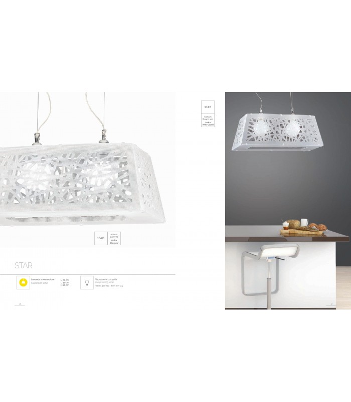Artempo Star sospensione è una lampada che si caratterizza per la sua elevata luminosità garantita dalla fonte luminosa che comprende due lampadine a basso consumo. La luce emessa viene infatti filtrata dal diffusore in acrilux che regala un ottimo effetto visivo.